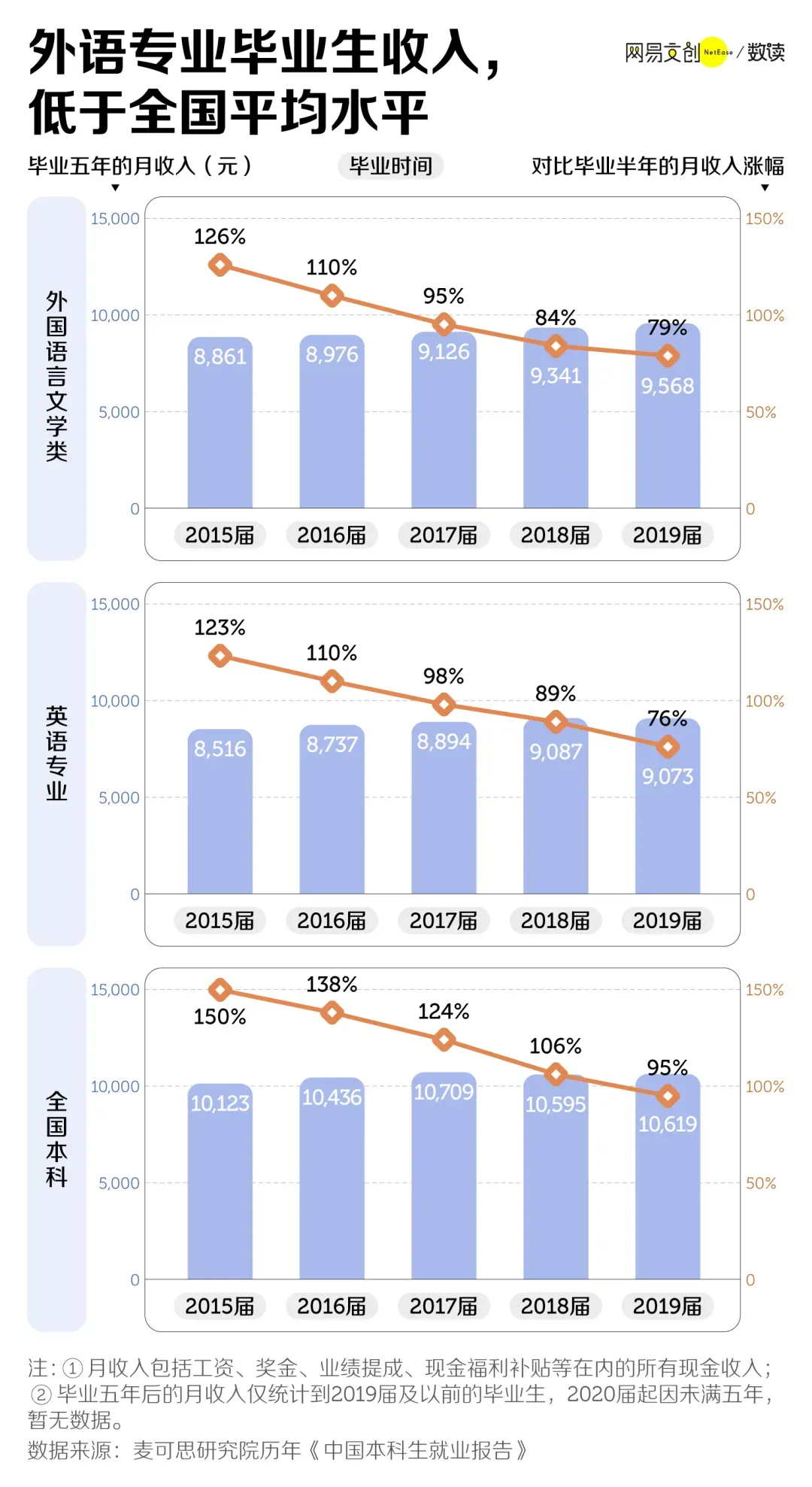 笔据麦可想发布的数据,以2019届为例,异邦话语体裁类学生毕业五年后,月收入在9568元,最常见的英语专科更是缩水到9073元。