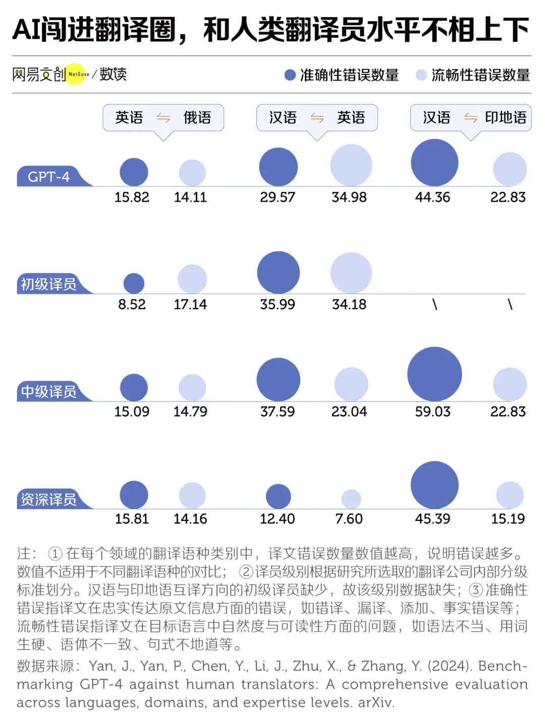在一项针对GPT-4的实测探究中,探究东说念主员把不同水平的东说念主类舌人拉上擂台,登第了三组语种相比翻译默契,涵盖数据储备丰厚的英语、资源中等但结构复杂的俄语和汉语,以及相对稀缺的印地语[8]。